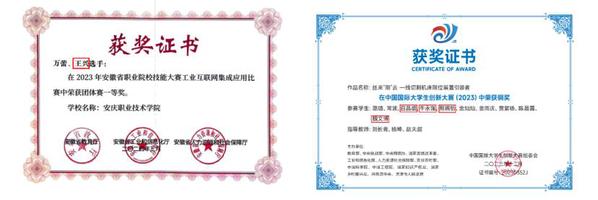 工业互联网工程技术实训室 学生成果: 学生在安徽省职业院校技能大赛中荣获一等奖、“挑战杯”大学生课外学术作品竞赛全国三等奖、中国国际大学生创新大赛国赛银奖、铜奖。