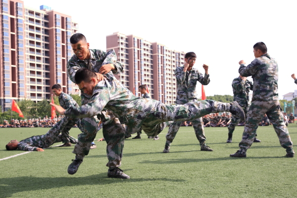 典礼上,部队教官进行了作战演练和军礼拳表演.