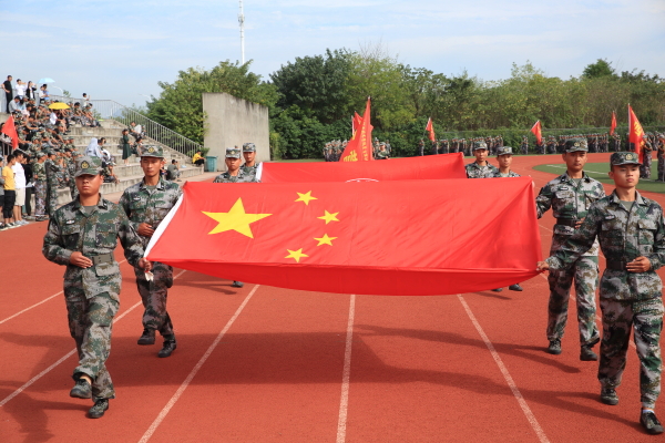 军训优秀学员代表机电工程系黄程同学作军训感想发言,张家喜老师带领全体师生同唱《我和我的祖国》。(文/陈颖 图/闻胜海)