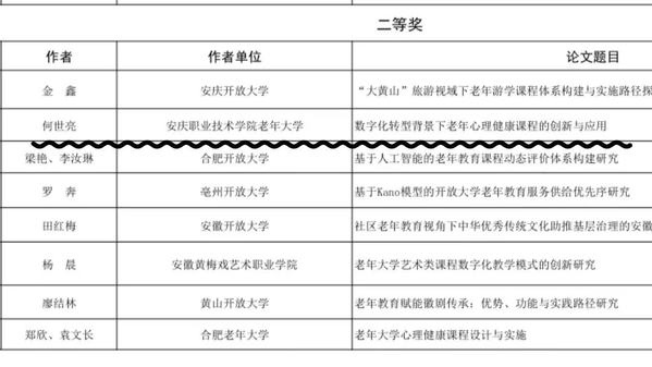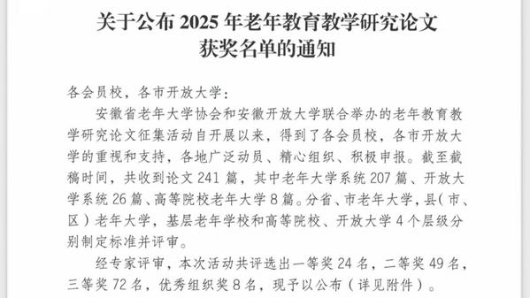 9月2日,由安徽省老年大学协会与安徽开放大学联合主办的“2025年老年教育教学研究论文征集评选活动”结果正式公布。我校何世亮老师撰写的论文《数字化转型背景下老年心理健康课程的创新与应用》,经专家评审委员会严格评审,凭借鲜明的时代视角与扎实的实践价值,荣获优秀论文二等奖。
