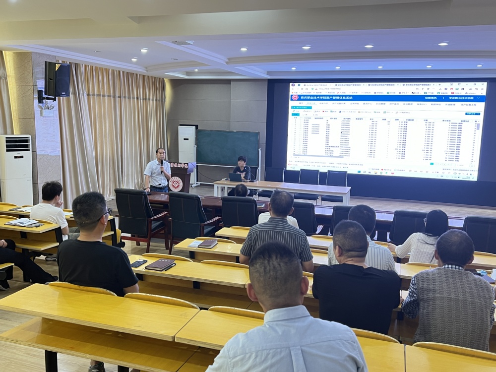 9月23日下午,我校在2号教学楼216召开资产管理信息系统培训会。校党委委员、副校长程飞出席会议并讲话,各二级学院、处室、中心资产负责人和资产管理员参加会议。会议由国资办副主任王靳云主持。