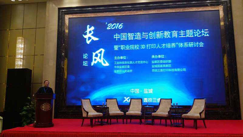 由工业和信息化部人才交流中心主办,盐都区委组织部、盐城国家高新技术产业开发区、西锐三维打印科技有限公司具体承办的2016年新型工业化能力建设“长风论坛”中国智造与创新教育主题论坛于2016年11月26日-27日在盐城高新区举办。本次论坛的主题为“中国智造与创新教育”,围绕西锐三维3D打印人才培养体系展开研讨。我院副院长谭维奇应邀参加本次论坛并在研讨会上交流发言。