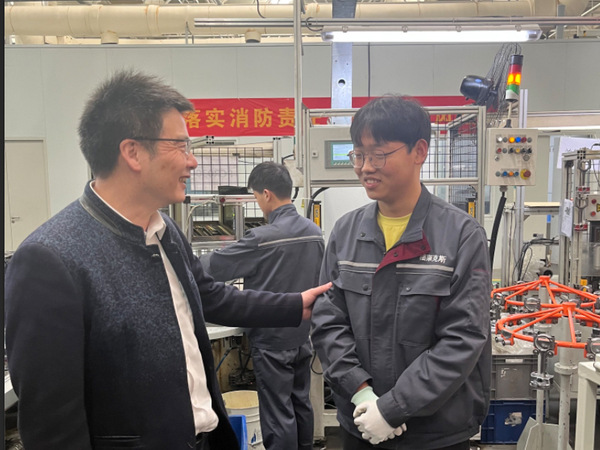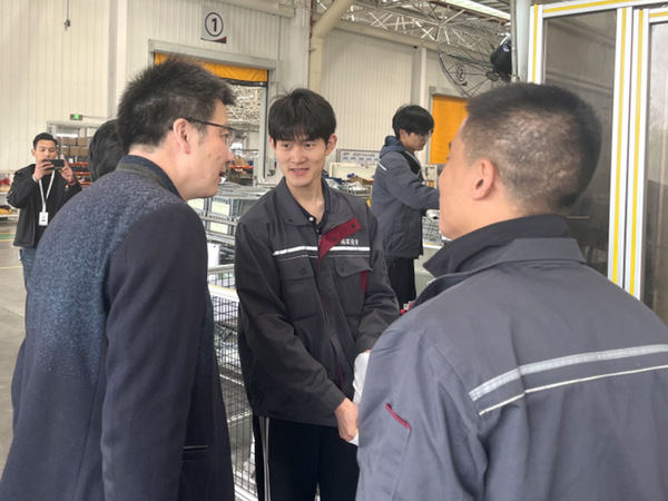徐英武、吴福贵一行首先走访了实习车间,和同学们交流在一起,询问同学们实习情况和生活情况。就大家所关心的问题,现场与企业负责人进行沟通解决。徐英武还鼓励同学们保持谦虚、踏实作风,多学习、多实践,在岗位工作中不断磨砺自身,成长成才。