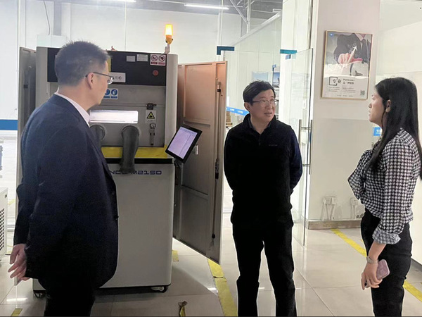 在企业负责人的引导下,一行四人走进加工车间,了解到企业生产现状、制作工艺以及3D打印成品的流程等细节。