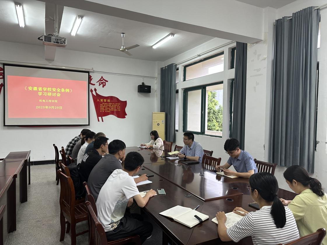 为认真贯彻落实习近平总书记关于安全生产的重要论述,深入践行“生命至上、安全第一”的理念,树牢底线思维,全面落实《安徽省学校安全条例》,常态化推进学院安全风险隐患排查整治工作,9月20日下午,机电工程学院在1号教学楼208会议室组织召开《安徽省学校安全条例》专题研讨会。学院党总支副书记徐英武,辅导员、班主任等参会。