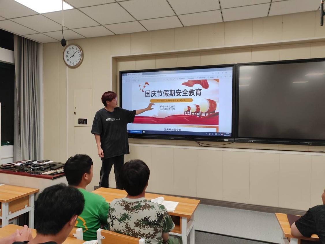 2023年9月26日,机电工程学院组织各班级开展了国庆安全教育主题班会,旨在强调国庆假期安全出行的重要性,以及如何在假期中保证自己人身安全财产安全等。