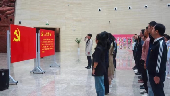 活动现场,面向鲜红的中国共产党党旗,全体党员同志一起高举右拳,庄严宣誓。字字句句,神圣而豪迈,体现了党员同志们对中国共产党的无限忠诚。