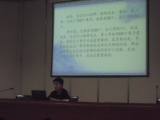 为了做好学生的就业指导工作,让同学们树立正确的就业观、择业观,在系团总支的邀请和安排下,06级毕业生张震同学回到母校,5月27日中午在院学术报告厅以亲身经历为我系08、09级学生做了一场精彩的报告。通过报告和互动让08、09级同学就毕业后怎样选择好自已的职业受到了很好的启发。