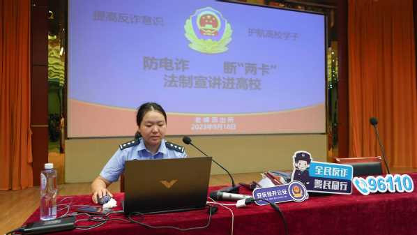 活动现场,老峰派出所葛辉警官以“防电诈、断‘两卡’法制宣传进高校为主题,通过典型案例讲解、精准的数据分析,深入浅出地介绍了电信诈骗的常见形式、惯用套路以及防范措施。同时对于公安部的专项行动“断卡”行动和帮信罪进行了详细地解读。讲座过程中,为了增强反诈宣传效果, 葛警官还与同学们进行了互动,现场气氛活跃。她从高校青年的特点出发,再次提醒大家提高警惕,增强防范意识,护好钱袋子。