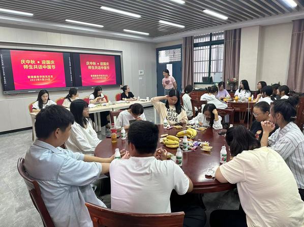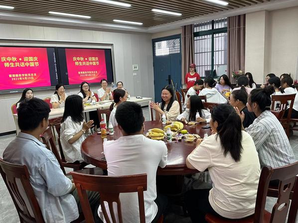 9月29日中秋节的上午,管理服务学院在三号教学楼202教室举办了“庆中秋 迎国庆”留校学生茶话会活动。院党总支书记、院长陈颖、党总支副书记丁凡、副院长李敏、团总支副书记练思雨、2023级留校新生代表及老生代表等40余人参加活动。茶话会由学生管理科科长汪婷主持。