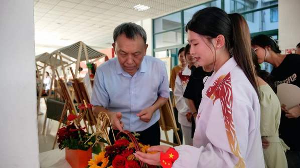 活动现场气氛热烈而有序,一件件创意新颖、制作精良的手工作品展现在大家面前。旅游管理专业学生完成的中式插花《万古长青》,以松、柏、菊、竹为主要花材,寓意四季常青,祖国永远繁荣昌盛;《硕果累累》,以麦穗、果实点缀,寓意祖国建设结出硕果;《杨帆远航》以船为造型,寓意乘风破浪、杨帆远航,寄托了对祖国的美好祝愿。