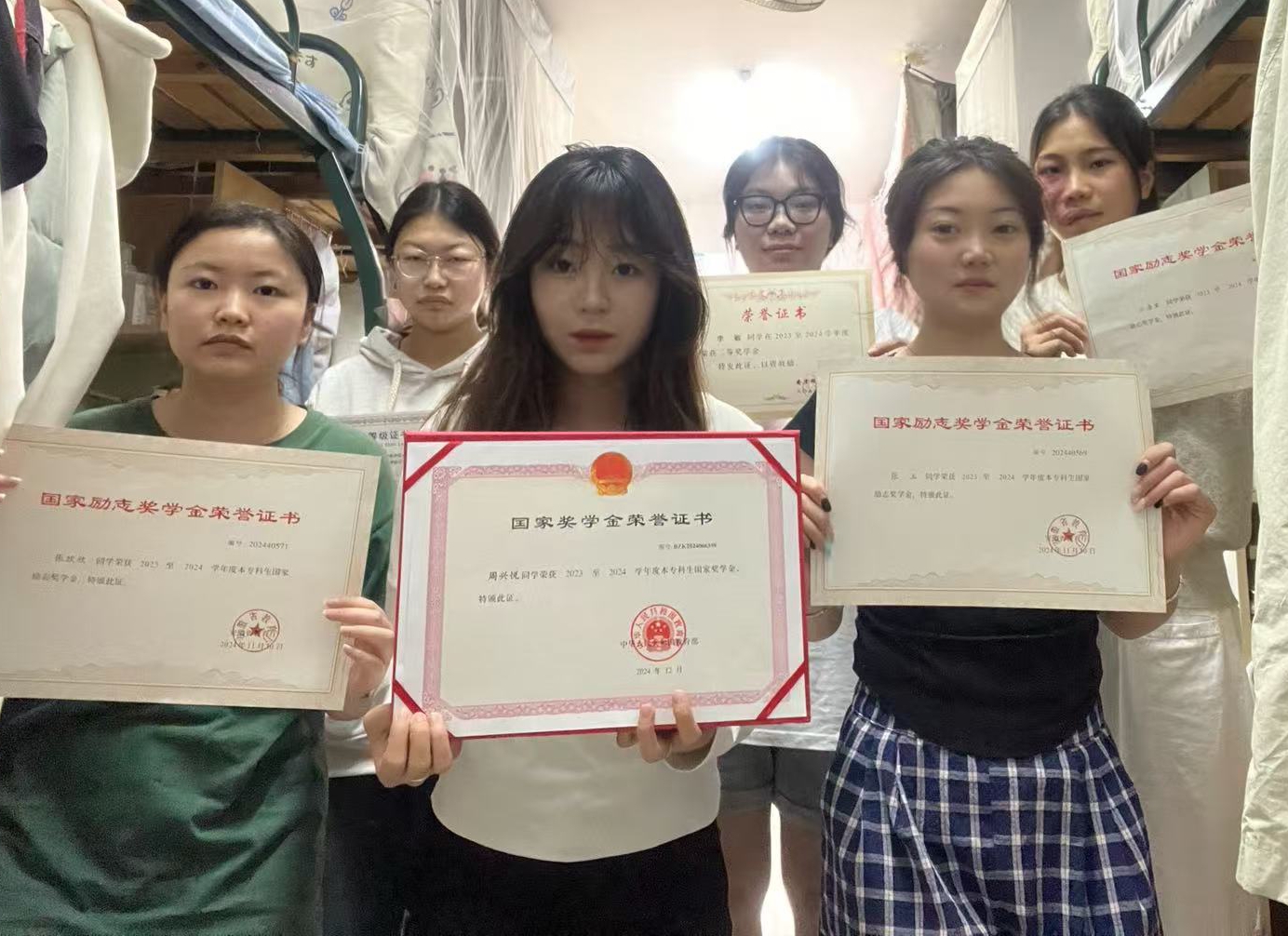 宿舍成员周兴悦荣获2024年度国家奖学金,专注高效、深度钻研是其学习常态。她不仅在省级研学旅行技能大赛中屡获佳绩(2023年三等奖、2024年三等奖),还荣获校级英语口语技能大赛、“青春安徽宣讲员”大赛等多项荣誉,并获评校级“三好学生”、“优秀共青团员”称号。