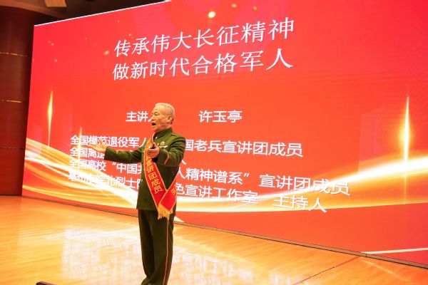 欢送会从红色宣讲开始,全国模范退役军人、皖北烈士陵园许玉亭红色宣讲工作室负责人许玉亭为全体人员作题为《中国共产党人精神谱系——长征精神》宣讲报告。李五一宣读了我校毕业生2025年春季从迎江区入伍的预定新兵名单。六个二级学院的主要负责同志分两批为预定新兵佩戴入伍绶带和红花。随后,预定新兵毕业生通过向家长代表敬献鲜花的方式表达对家长的感谢。