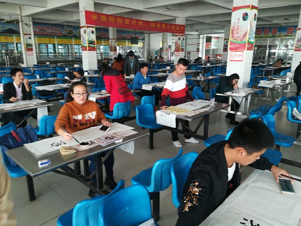为贯彻落实十九大精神,展示弘扬中华优秀传统文化,响应院团委十九大精神“进社团”主题实践活动,11月15日中午,院逸风书法社、院学生会在2栋216教室和食堂一楼联合举办了“书法添彩•翰墨情怀”书法比赛。其中180余名同学参加硬笔比赛,40多名同学参加软笔比赛。