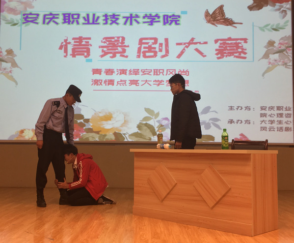 11月20日晚,由我院风云话剧社、大学生心理协会联合举办的“情景剧”大赛在图文信息一楼报告厅举行。比赛邀请院心理健康咨询中心负责人何世亮、心理健康教研室主任张铮、院风云话剧社指导老师吴紫英、心理健康教师刘成俊、院团委王晓林担任评委,近600名学生观看了此次比赛。