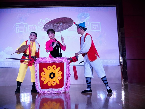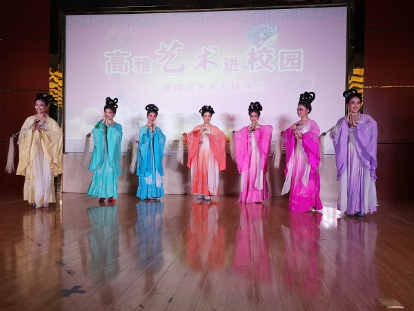 演出在经典曲目《鹊桥》的表演中拉开了序幕。演员的唱腔优美,舞姿妙曼,引来了同学们赞叹连连,《打猪草》描述了一对青年男女因打猪草损坏了竹笋产生矛盾,通过对歌化解矛盾的故事;《天女散花》、《推车赶会》、《开门调》等一个个经典曲目纷纷展现在师生面前,观众被演员们的精彩表演深深吸引;黄梅歌舞《红梅赞》将晚会气氛推向高潮,激昂的音乐响起,“江姐”高举红旗在舞台上奔跑,灯光与背景投影交相呼应,仿佛将观众们带回到了那个热血的革命年代。整场演出优美的唱腔感人肺腑,铿锵的鼓点扣人心弦,诙谐的对白令人捧腹,五彩的戏服华丽炫目。大家在短短的一个半小时内享受了一场视听盛宴,感受到了黄梅戏艺术的巨大魅力。