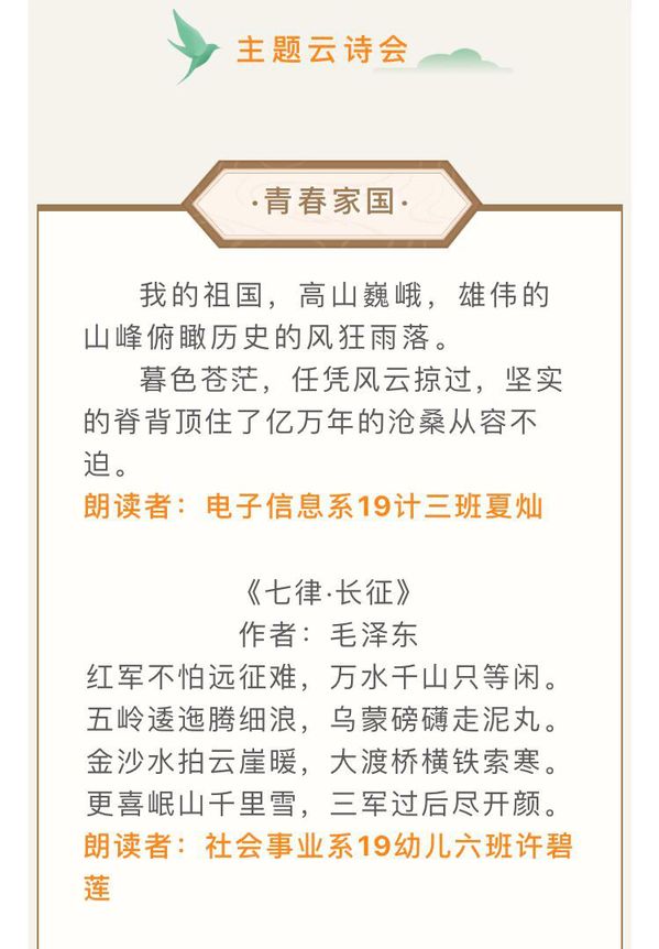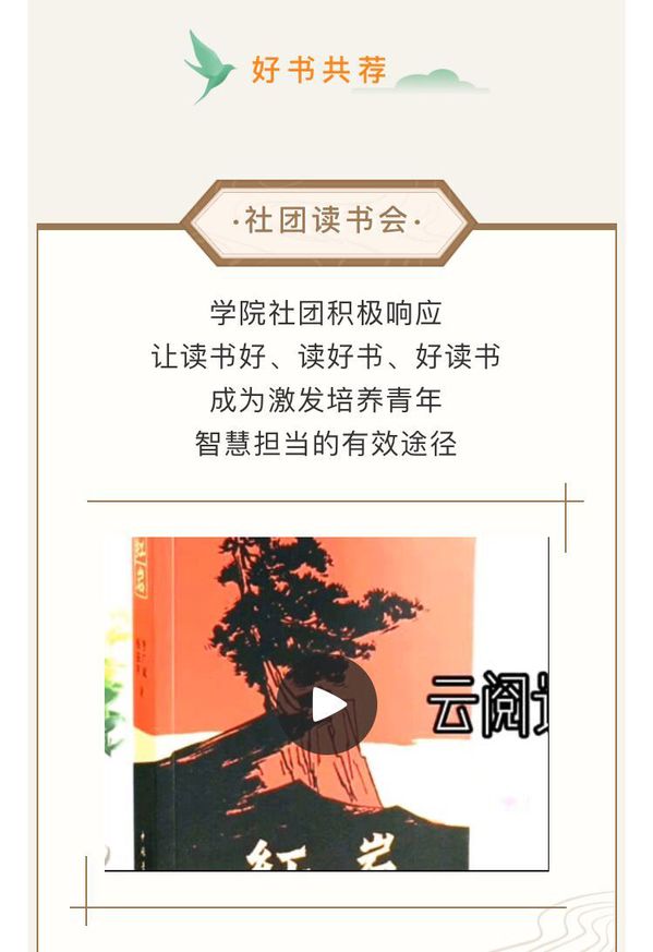 为深入学习贯彻十九大精神,促进我院地方技能型高水平大学内涵建设,引导和增强师生树立终身学习的意识,营造“读书好、读好书、好读书”的书香氛围,积极响应学院开展“书香校园”师生读书活动,院团委组织我院团学组织开展“共读经典·悦享阅读“云阅读活动。同学们积极参与,开展线上主题云诗会接力、社团读书会、好书共荐、共度有感等网络活动。通过读书活动,旨在分享读书的快乐,交流读书的收货,将学生读书的自主意识与适当引导结合起来,倡导良好的读书风气。(文/陈颖 图/各系团总支)