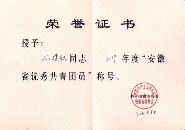 近日,为激励全省团员、团干部和各级团组织奋发有为、再创佳绩,共青团安徽省委表彰了一批省级优秀共青团员、优秀共青团干部和先进基层团组织。我院机电工程系17级数控1班孙建秋同学获2019年度安徽省优秀共青团员称号。