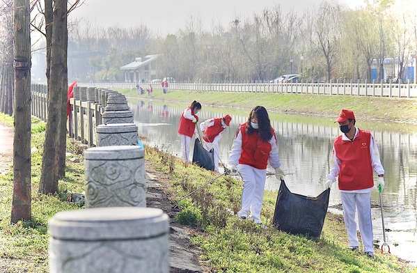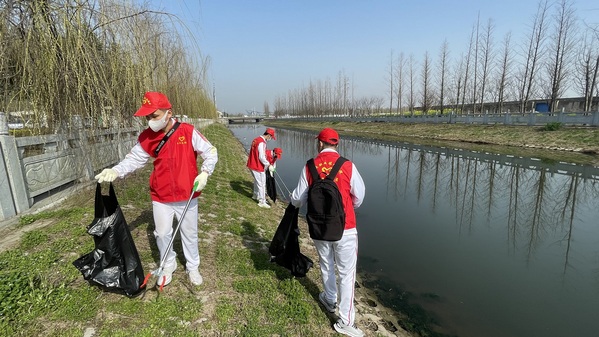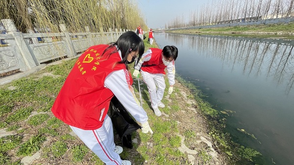 沐浴着春日的阳光,“小雷锋”们身穿统一的红色志愿者马甲,穿梭于河道两岸,认真清理河面漂浮的废物垃圾和河岸的烟头、农业废弃物等,大家两两一组,默契配合,地毯式清理,不放过任何一个死角。