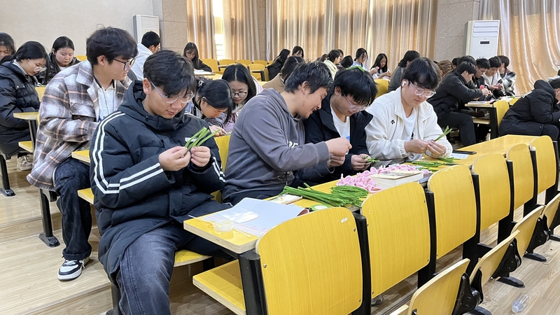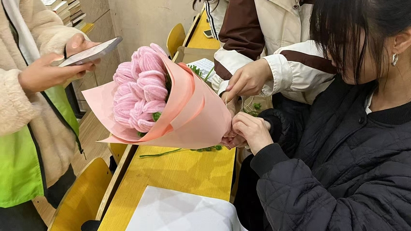 商务学子聚集316教室,为现代商务学院的老师准备一份特别的惊喜。他们满面笑容,将一根根普通的扭扭棒逐渐变成一片片精美的花瓣与叶片。大家专注于手中的创作,或独自钻研,或相互协作,时不时还分享着彼此的创意灵感。经过一番努力,一束束形状别致、独具匠心的扭扭棒花束在他们手中诞生,这些花束无论是造型还是色彩搭配都丝毫不逊色于鲜花。